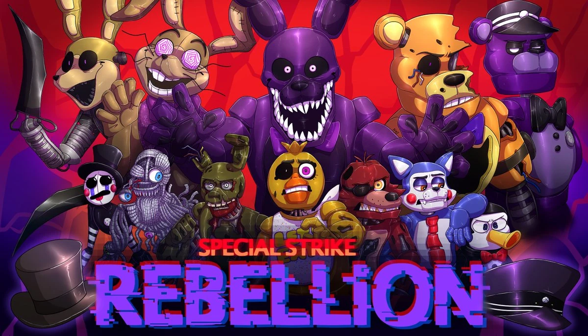 The Special Strike: Rebellion is an SFM Five Night's at Freddy's movie, directed by TheHotttestDog, and was released in June 21st, of 2021. Chica was voiced by Grayfilms, Chief by Hunter, Glitchtrap by VaporTheGamer, Cindy by ZerrekTheDog, Blank by MCWDD, QXR by Derpy_Horse4, Vinnie by Cyno, Security Puppet by Sparkleeze, Cat by Lucifer Magne, Rat by Entaru, Obese by TheHottest Dog, Shadow Man by E.Breddy, Foxy's Nightmare by Roux36, THE_END by THE VOICES, Freddy by Shadows In The Void, Bonnie by Packardfam, Foxy by FoxyTheVA, and Springtrap by Mikegamer023.